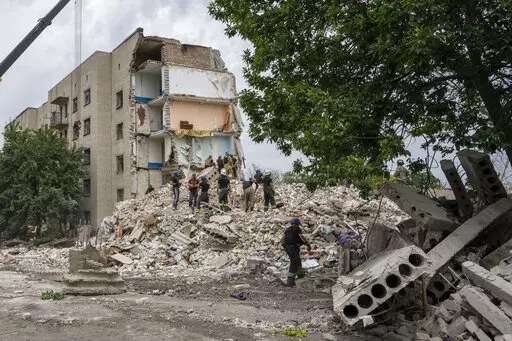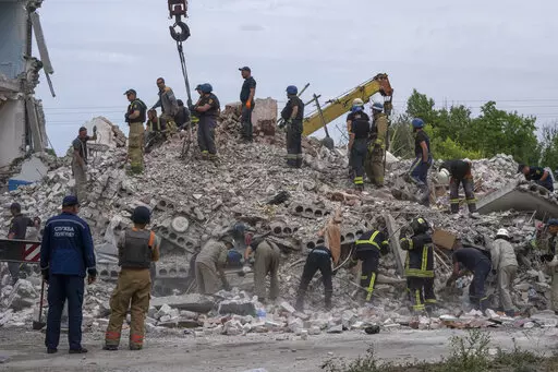 CHASIV YAR, Ukraine (AP) — Dozens of Ukrainian emergency workers labored Sunday to pull people out of the rubble after a Russian rocket attack smashed into apartment buildings in eastern Ukraine, killing at least 15 people. More than 20 people were believed still trapped.