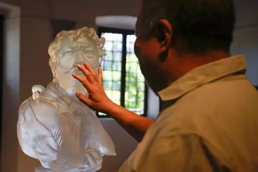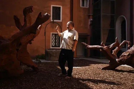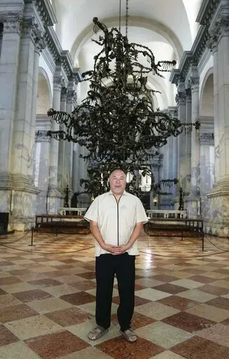 He stands by his 9-meter (29.5-foot), nearly 3-ton black glass sculpture, which is suspended over the central nave of the deconsecrated church of San Giorgio Maggiore, located opposite Venice's St. Mark’s Square. Titled “The Human Comedy: Memento Mori,” the sculpture is the centerpiece of an Ai exhibit at the church that opens Sunday.
