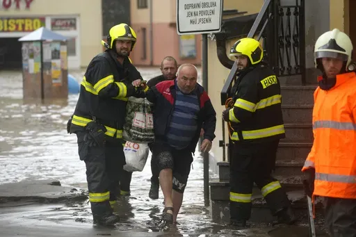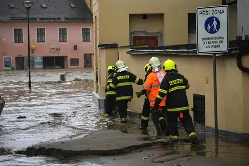 In the city of Opava, up to 10,000 people out of a population of around 56,000 have been asked to move to higher ground. Rescuers used boats to transport people to safety in a neighborhood flooded by the raging Opava River.