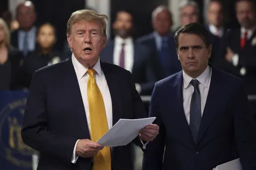 The former president and current presidential candidate has routinely stepped to a metal barricade outside the courtroom in lower Manhattan to face cameras and get the last word on the day's proceedings. As the trial has wound down, his speeches — he rarely acknowledges shouted questions — more frequently consist of reading the words of friendly commentators from a sheaf of papers.