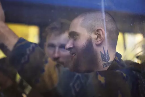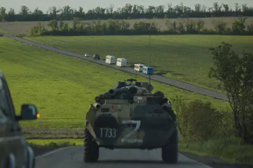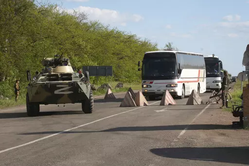 Footage shot by The Associated Press shows the convoy was escorted by military vehicles bearing the pro-Kremlin “Z” sign, as Soviet flags fluttered from poles along the road. About two dozen Ukrainian fighters were seen in one of the buses.