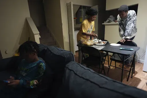 Still wearing her visor and gray “No One Out Pizzas The Hut” shirt, she slumps sideways after a recent work shift, resting an elbow on the folding table surrounded by four folding chairs where the family eats. The living room furniture is sparse but the home is tidy. A yellow mop bucket sits near the entryway, and a small vacuum rests against the closet door. She only takes a moment to rest before changing into Looney Tunes sweatpants and a yellow T-shirt, scooping fajitas onto plates for the kids' dinner, and packing up the leftovers. Then the teens disappear into their bedrooms, and her Minecraft pajama-clad youngest curls up next to her on the couch, playing a game on a bright red console.
