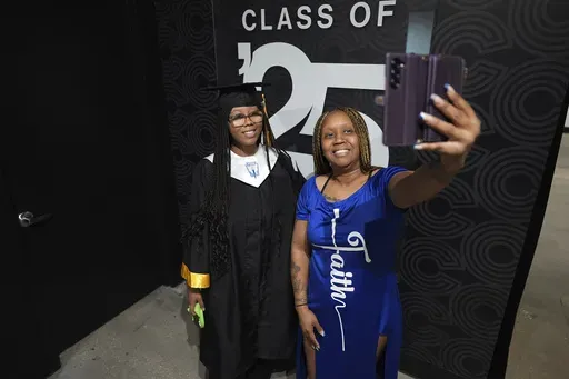 At the photography studio, Yeldell and her daughter pose for a selfie against a backdrop that reads “Class of ’25.” Yeldell wears a sleek, royal blue dress that reads “Faith” in white cursive text, her daughter in a black cap and gown. Both women's hair is arranged in long, elegant braids with the ends curled.