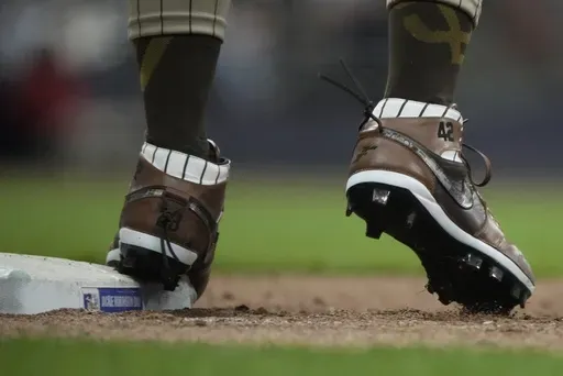 The San Diego Padres star stutter-stepped into third base with his right cleat, designed with the look of the team's home white pinstriped jerseys from 1998, when Gwynn led the Padres to their most recent World Series.
