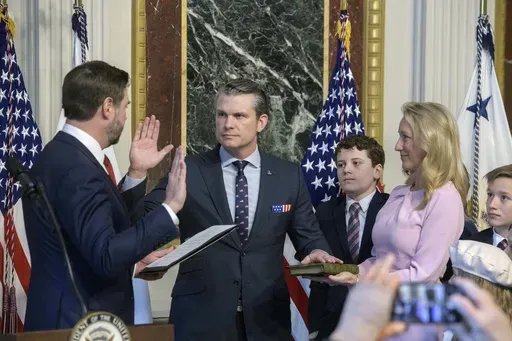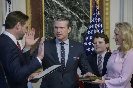 Hegseth took the oath from Vice President JD Vance in the Eisenhower Executive Office Building with Hegseth's wife, Jennifer Rauchet, at his side and Republican senators looking on. The ceremony came less than 12 hours after Vance broke a 50-50 tie in the Senate to narrowly seal Hegseth's confirmation.