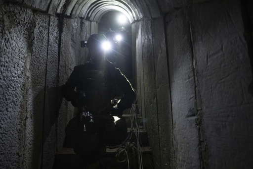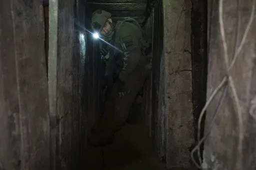 A makeshift ladder led to the narrow underground pathway, about 2.5 meters (8 feet) below. The tunnel was hot and humid, with walls lined with concrete and electrical wires. Farther inside was a bathroom, where the military said it found evidence that hostages had been there, including their DNA.