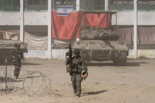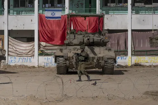 In another building, the walls were blasted out of several apartments. Large mounds of dirt surrounded the area, apparently from Israeli bulldozers searching for buried explosives. A tank was parked outside an empty school, where an Israeli flag was hung from the exterior walls. The sound of what appeared to be a drone buzzed overhead, and gunfire could be heard in the distance.