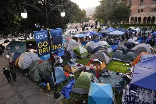 Announcements broadcasted on the University of California, Los Angeles campus Wednesday evening told demonstrators to disperse or they would be arrested and face a misdemeanor charge. The protesters largely stayed in place, chanting pro-Palestinian slogans. Police stood by strapping on riot gear.