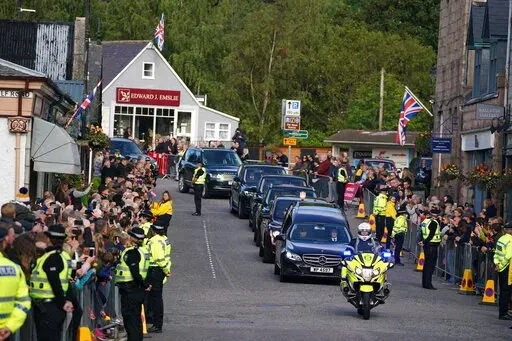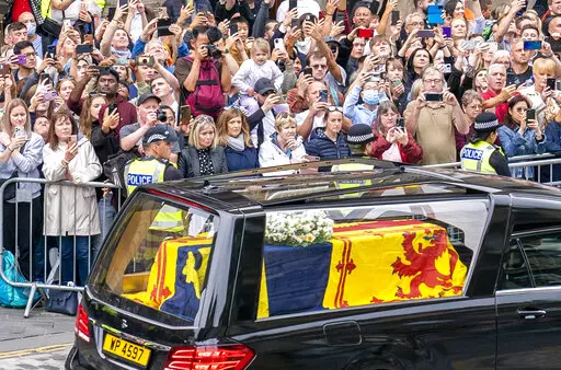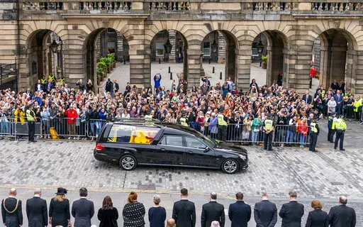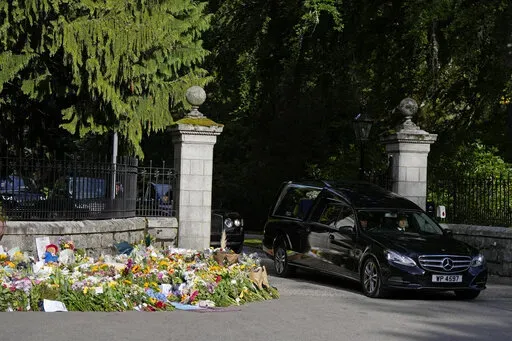 The hearse drove past piles of bouquets and other tributes as it led a seven-car cortege from Balmoral, where the queen died Thursday at age 96, for a six-hour trip through Scottish towns to the palace in Edinburgh. The late queen’s coffin was draped in the Royal Standard for Scotland and topped with a wreath made of flowers from the estate, including sweet peas, one of the queen’s favorites.
