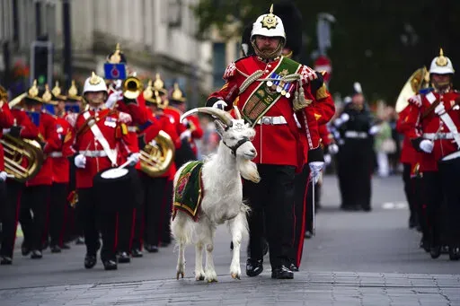 In Belfast, bells chimed and a bugler played before the proclamation was read. It was followed by a 21-gun salute and a military band playing the anthem, “God Save the King.” In Wales, a regimental mascot goat accompanied the 3rd Battalion of the Royal Welsh regiment at the ceremony at Cardiff Castle.