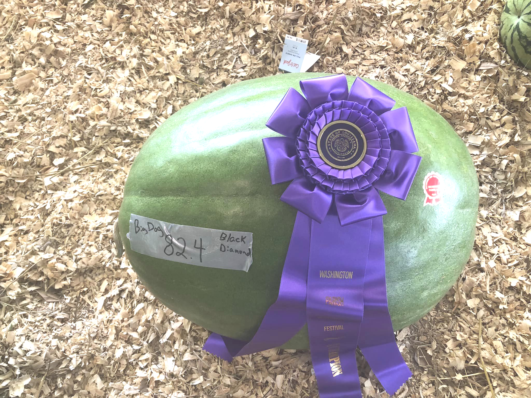 Shown above is the 82.4 pound Black Diamond watermelon grown by Daryl Burnthorn, which placed first in the heaviest watermelon contest. Burnthorn, of the Thomas area, is no stranger to growing award-winning watermelons. Last summer, his 220.45 pound Black Diamond officially broke a state record. Last summer he also had a Carolina Cross watermelon that topped the scales at 232.95 pounds.