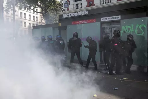 Tensions erupted in Paris, as some demonstrators smashed windows at some banks, a fast-food restaurant and a real estate agency, apparently partially the work of masked men dressed in black. French police moved in, firing rounds of tear gas. That failed to stop a woman from attacking a firefighter trying to douse a street fire.