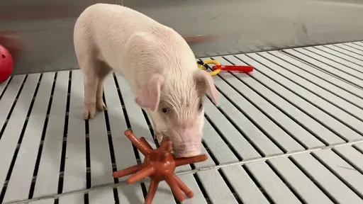 Company video shows piglets running around behind the protective barrier, chewing on toys and nosing balls back and forth.