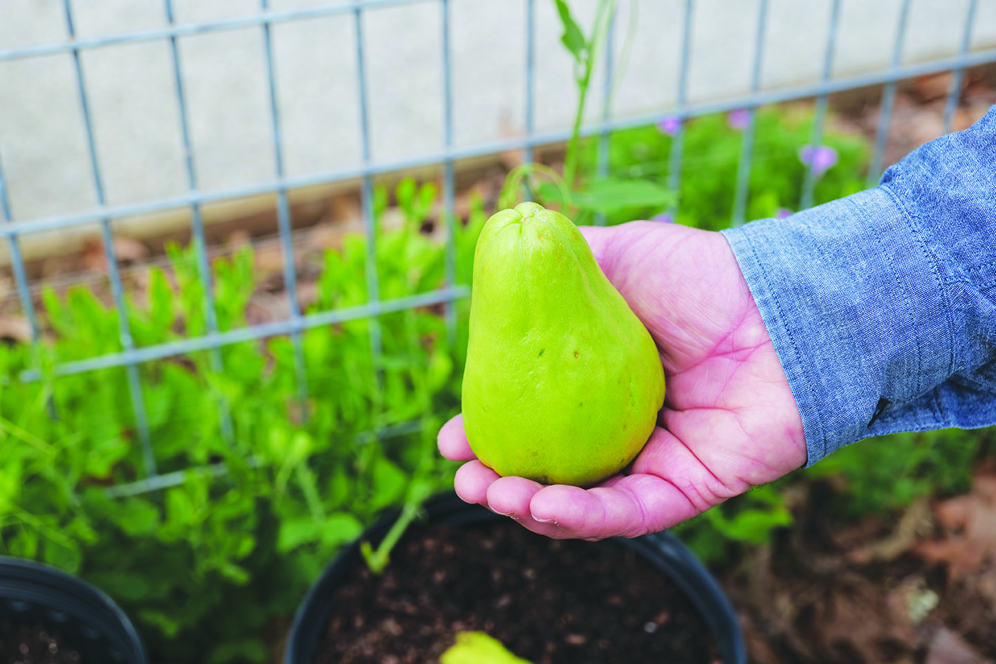 Now, mirlitons don’t grow from small, dried seeds like tomatoes or many other crops. Each mirliton contains one embryo, and the entire fruit essentially is a seed. That means you’ll need to plant the whole thing to grow a mirliton vine.
