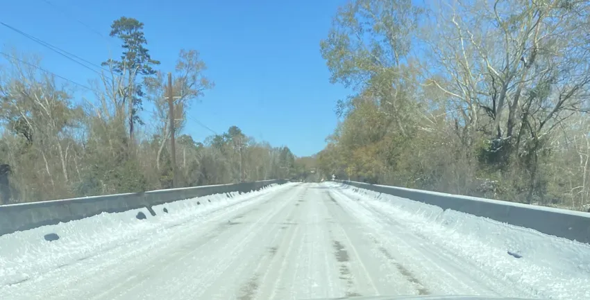 Shown above is the Enon bridge on Highway 437 crossing the Bogue Chitto River. This photo was shot at noon on Wednesday. Highway 437 was relatively clear but, as you can see, the bridge was quite icy. This same scene was repeated at many other bridges in the parish, where clear roadways fed into ice covered bridges. Drivers, be cautious!
