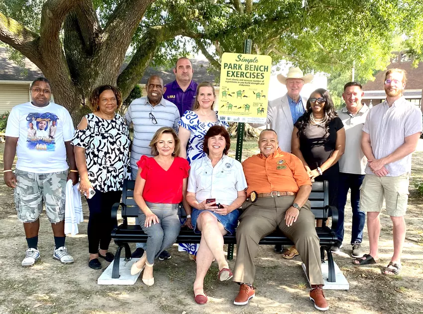 Several benches along with signs featuring instructions for simple exercises and tips for pedestrian safety were recently installed in Franklinton thanks to the LSU AgCenter Healthy Communities initiative. From left are, back row, Armond Barker, Emma Route, Alderman T.J. Butler, former parish Councilman David Anthony, AgCenter agent Valerie Vincent, Sheriff Randy Seal, Candace Bickham, Minister Joe Felder and Jordan Felder. Front row, state Rep. Malinda White, state Sen. Beth Mizell and Franklinton Mayor Greg Route. Photo by Valerie Vincent
