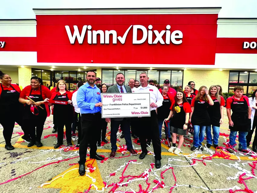 Winn-Dixie donated $1,000 to the Franklinton Police Department as part of its grand re-opening celebration in March of 2022 following a remodeling of the store. Franklinton Police Chief Justin Brown, center, accepted the check from Todd Edwards, right, manager of the store. Edwards later passed away unexpectedly.