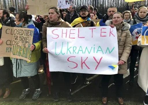 “We are fighting for the whole democratic world here. If we don’t stop them in Ukraine, they will go next to the European Union. They will be at your door,” said Artemii Sattarov, draped in a Ukrainian flag. That is why we are asking here to close the (airspace), to provide military help to Ukraine.”