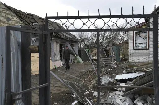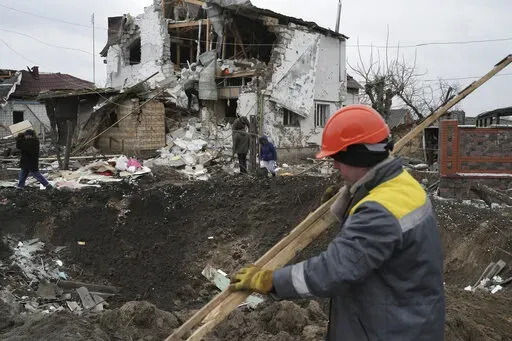 In Hlevakha, an urban area about 35 kilometers (about 22 miles) southwest of the capital, a barrage of missiles followed a drone attack that damaged the two-story home of Halyna Panasian. The damage included a deep crater in the courtyard, a large hole in the roof and pieces of debris scattered about the house.