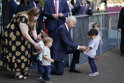 THE FACTS: The photo was digitally altered to make it appear as if Biden’s hands were under the child’s shirt. The original photo, which was taken by an AP photographer in 2021, shows the child stretching their shirt to show the president, who is pointing at the shirt in return. The altered photo, however, appears to show Biden kneeling in front of a child, with his hands underneath the kid’s gray shirt. The photo was shared on Instagram with a caption above the photo that reads, “This is what people ‘voted’ for?” The original photo was taken on Oct. 15, 2021, while Biden was visiting the Capitol Child Development Center in Hartford, Connecticut. In the original, the child is stretching their top to show the president, and Biden is pointing at the shirt. A comparison of the two images shows the version circulating on social media has been altered to move the child closer to Biden, and another child standing in the background against a fence has been edited out. A watermark faintly visible on the doctored photo is the name of a Twitter user who regularly posts altered videos that are satirical. They shared the altered image on Twitter in December 2022. C-SPAN also captured video of the moment the photo was taken, and confirms Biden never touched the child in the way the edited image suggests. The footage shows Biden talking to the children at the playground and later giving the child in the photo a hug.