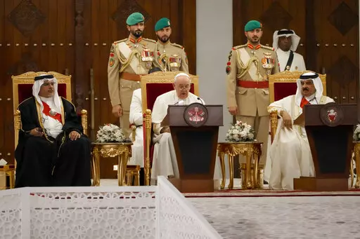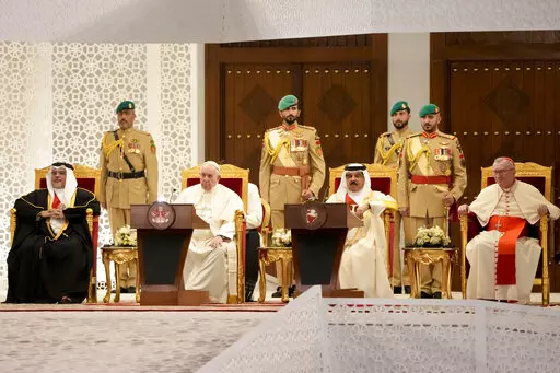 Francis referred indirectly to the sectarian strife as he arrived in the desert town of Awali and met with Al Khalifa at the Sakhir royal palace in the first-ever papal visit to Bahrain. Speaking to government authorities and diplomats from the palace's glistening courtyard, Francis praised Bahrain’s tradition of tolerance and cited Bahrain's constitution, which forbids discrimination on the basis of religion, as a stated commitment that needs to be put into practice.