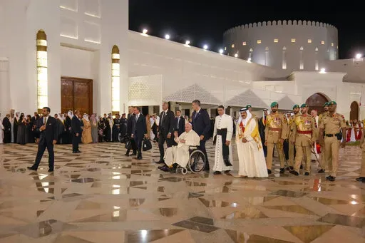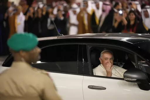 The 85-year-old Francis, who has been using a wheelchair for several months because of strained knee ligaments, said he was “in a lot of pain” as he flew to the Gulf. For the first time, he greeted journalists travelling with him seated rather than walking through the plane’s aisle.