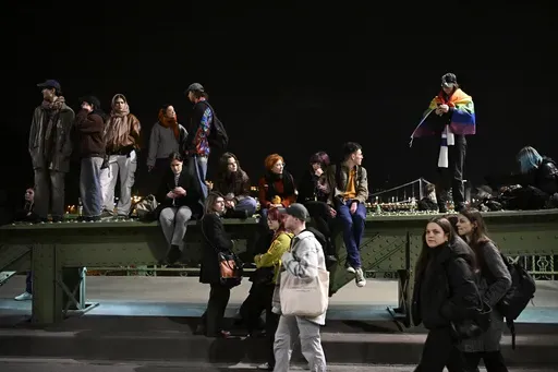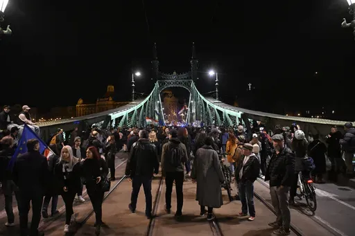 BUDAPEST, Hungary (AP) — Several thousand protesters blocked major thoroughfares and three bridges in the center of Hungary's capital on Tuesday in opposition to a recent law that effectively bans LGBTQ+ Pride events and restricts Hungarians' right to assembly.