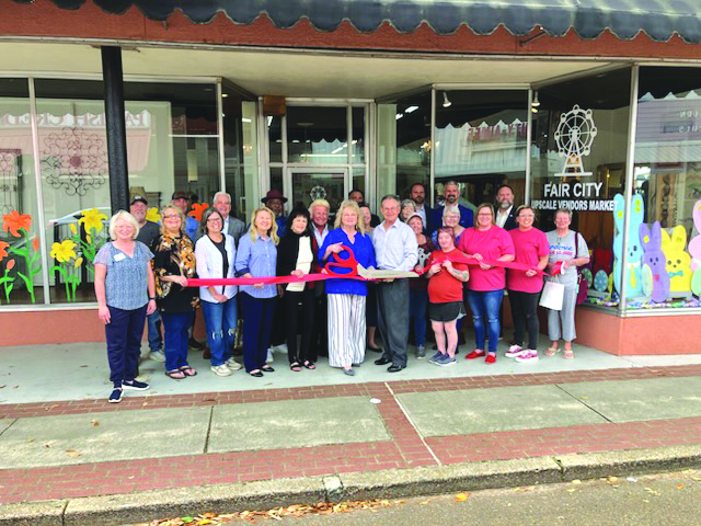 The ribbon cutting for Fair City Upscale Vendors Market was held on Saturday, March 15. In the photo above are, from left to right, front row: Penny Jones, Jo Anna Laird, Marcie Thames, Kim Windham, Linda Moseley, Owners Rhonda and Dale Robertson, Carol Creel, Macey Stephens, Sandra McDaniel, Ashley Wheat, Ashley Collett, and Ginger Varnado. 2nd row from left to right: Greg Windham, Timothy Thames, Ryan Seal, Sherman Davis, Johnny Passman, Jackie Blackmon, Rep. John Wyble, Denise Materne, Kyle Varnado, Sheriff Jason Smith, and Stuart Varnado.
