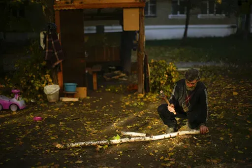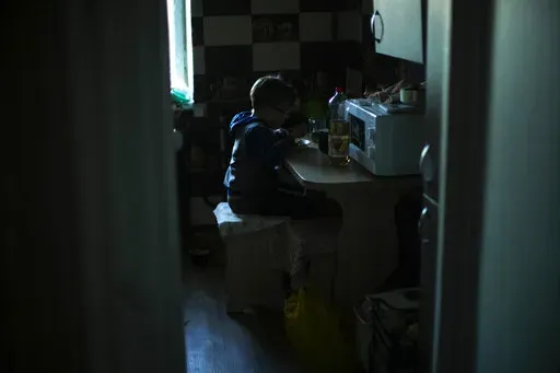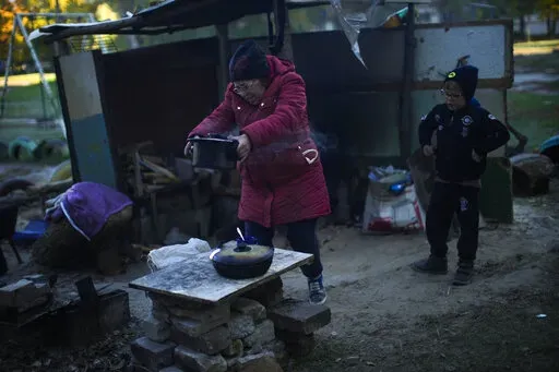 KIVSHARIVKA, Ukraine (AP) — Nine-year-old Artem Panchenko helps his grandmother stoke a smoky fire in a makeshift outdoor kitchen beside their nearly abandoned apartment block. The light is falling fast and they need to eat before the setting sun plunges their home into cold and darkness.