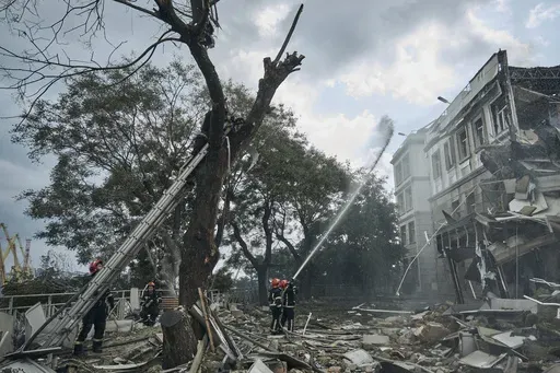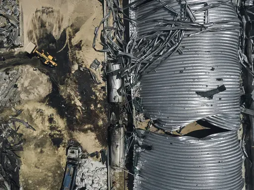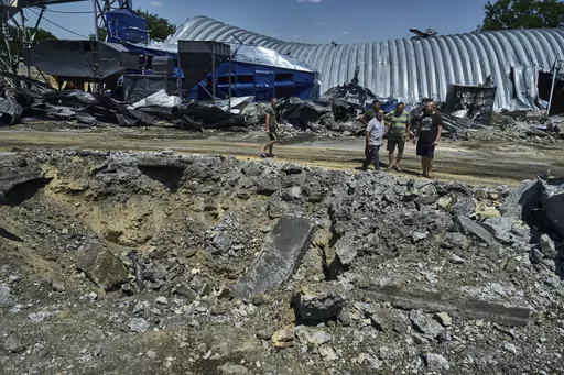 In the attack on the storage site, two low-flying cruise missiles started a blaze, then another struck during firefighting efforts, regional Gov. Oleh Kiper said. The barrage injured two people, damaged equipment and destroyed 100 metric tons (110 tons) of peas and 20 metric tons (22 tons) of barley, Kiper said.