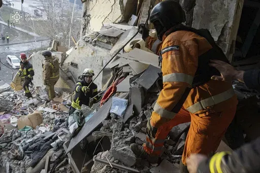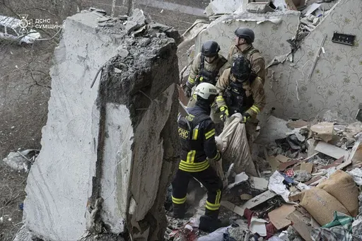 KYIV, Ukraine (AP) — A Russian drone blasted a hole in an apartment building in northeastern Ukraine during a nighttime attack, killing at least six people and wounding nine others, officials said Thursday.