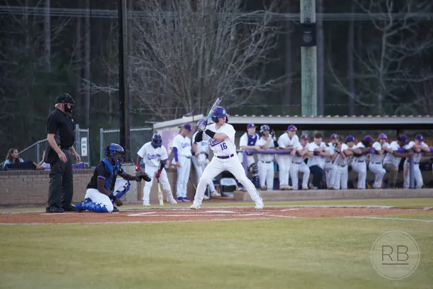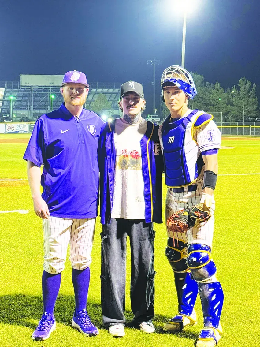 Blake Orman, center, poses with the Franklinton Demons baseball team after throwing out the first pitch to open the 2026 season.