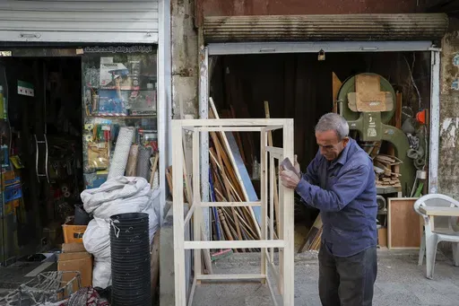 Nearby, Abou Samir, a carpenter, saws a piece of wood as he assembles a chest of drawers. There is no electricity to power his machinery, so he’s doing it by hand.