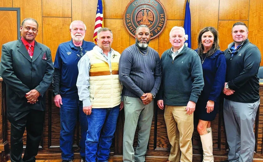 The 2026 Washington Parish Council with its newest leadership. From left: Clark Harry, Joe Culpepper, Vice President Steven Branch, President Reginald McMasters, Parish President Ryan Seal, Kim Wagner and Shawn Rice. Not shown is Councilman Carley King. Photo by Danielle Folks