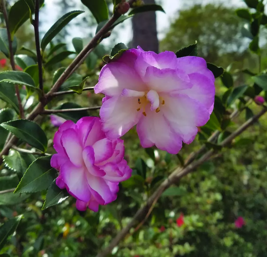 Camellias are popular sources of color in fall and winter gardens in the southeastern US. Most of the camellias blooming now, in late fall, are sasanqua camellias (Camellia sasanqua). These have smaller leaves and, generally, smaller flowers than Japanese camellias (C. japonica) but often have an abundance of blooms.