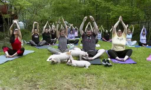 Wilbur, Charlotte and Bluey fit right into a growing trend of yoga with animals, adding some fun to the usual physical and mental wellness exercises at a class in central Massachusetts.