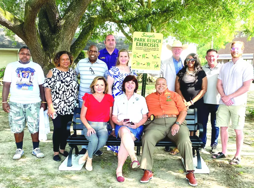 Several benches along with signs featuring instructions for simple exercises and tips for pedestrian safety were recently installed in Franklinton thanks to the LSU AgCenter Healthy Communities initiative. From left are, back row, Armond Barker, Emma Route, Alderman T.J. Butler, former parish Councilman David Anthony, AgCenter agent Valerie Vincent, Sheriff Randy Seal, Candace Bickham, Minister Joe Felder and Jordan Felder. Front row, state Rep. Malinda White, state Sen. Beth Mizell and Franklinton Mayor Greg Route.