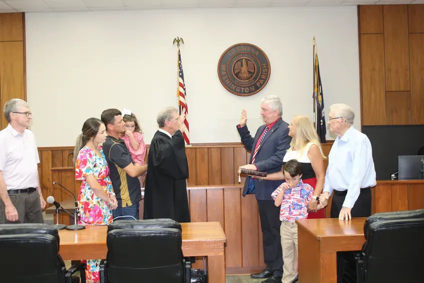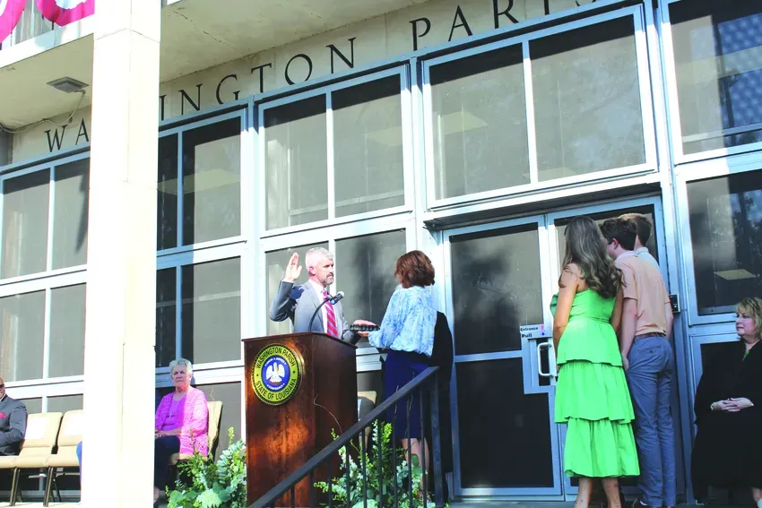 Jason Smith of Mount Hermon officially became Washington Parish Sheriff last Friday evening. He was sworn in to office in front of a crowd of deputies, other officials, and supporters. In the photo above, Smith is being sworn in by retired District Court Judge Bill Burris (obscured) as the new sheriff’s wife, Rebekah, holds the Bible.