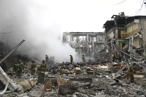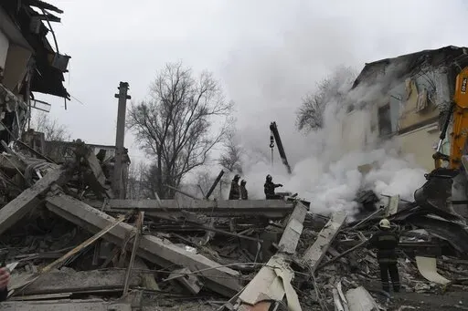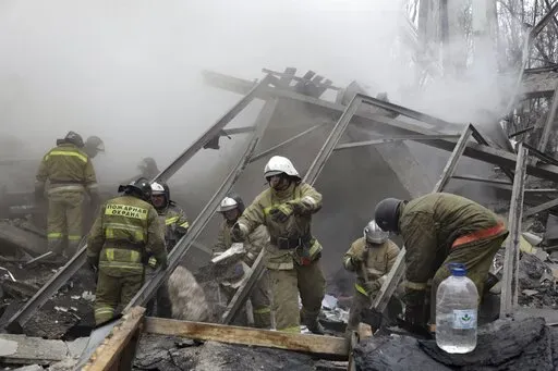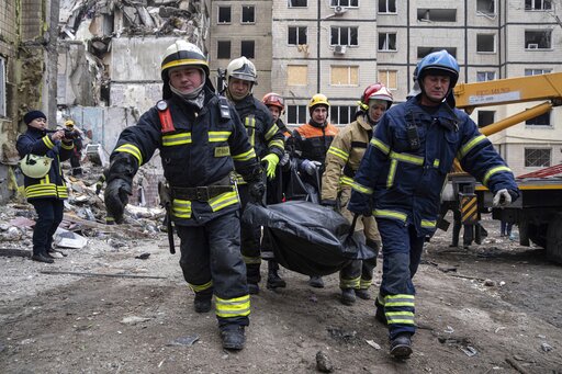DNIPRO, Ukraine (AP) — Ukrainian emergency crews on Monday sifted through what was left of a Dnipro apartment building destroyed by a Russian missile, placing bodies from one of the war's deadliest single attacks in months in black bags and gingerly carrying them across steep piles of rubble.