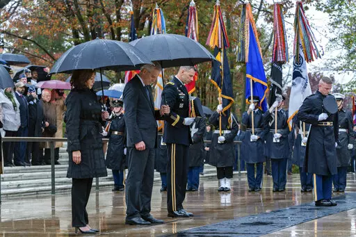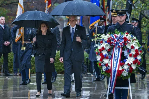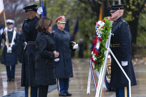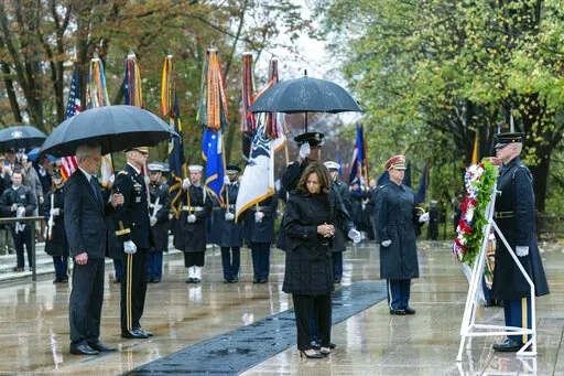 With President Joe Biden in Egypt for a United Nations conference on climate, it was Harris who placed the wreath in a somber ceremony at the Tomb of the Unknown Soldier, which is dedicated to deceased service members whose remains have not been identified. She arranged it carefully, fussing a bit with the ribbons to move them back in place after they were blown askew by the wind and rain.