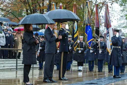 WASHINGTON (AP) — Under gray clouds and pouring rain at Arlington National Cemetery, Vice President Kamala Harris told the nation's veterans Friday their work makes America stronger, as the administration announced new support for children who live with wounded service members.