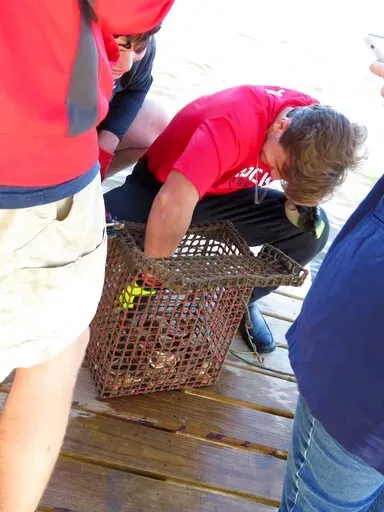 Students on a platform below the school’s long pier gently shake their oyster garden's wire cages as they pull them from the water, loosening mud and algae that might keep water and nutrients from baby oysters clinging to those shells.